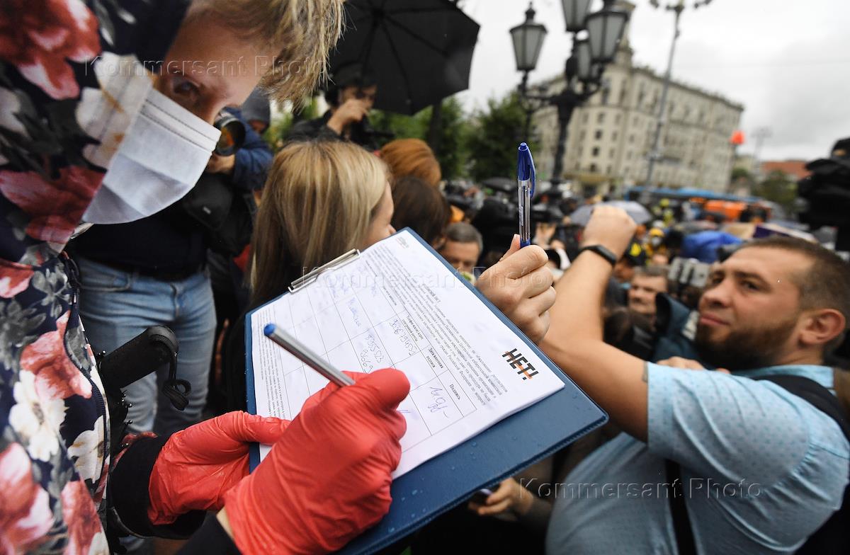 Сбор подписей под коллективным иском в суд с требованием отменить результаты общероссийского голосования по поправкам в Конституцию России. Акция прошла в Москве на Пушкинской площади. Несанкционированная акция протеста, начавшаяся после сбора подписей. Шествие протестующих на улице Петровке.