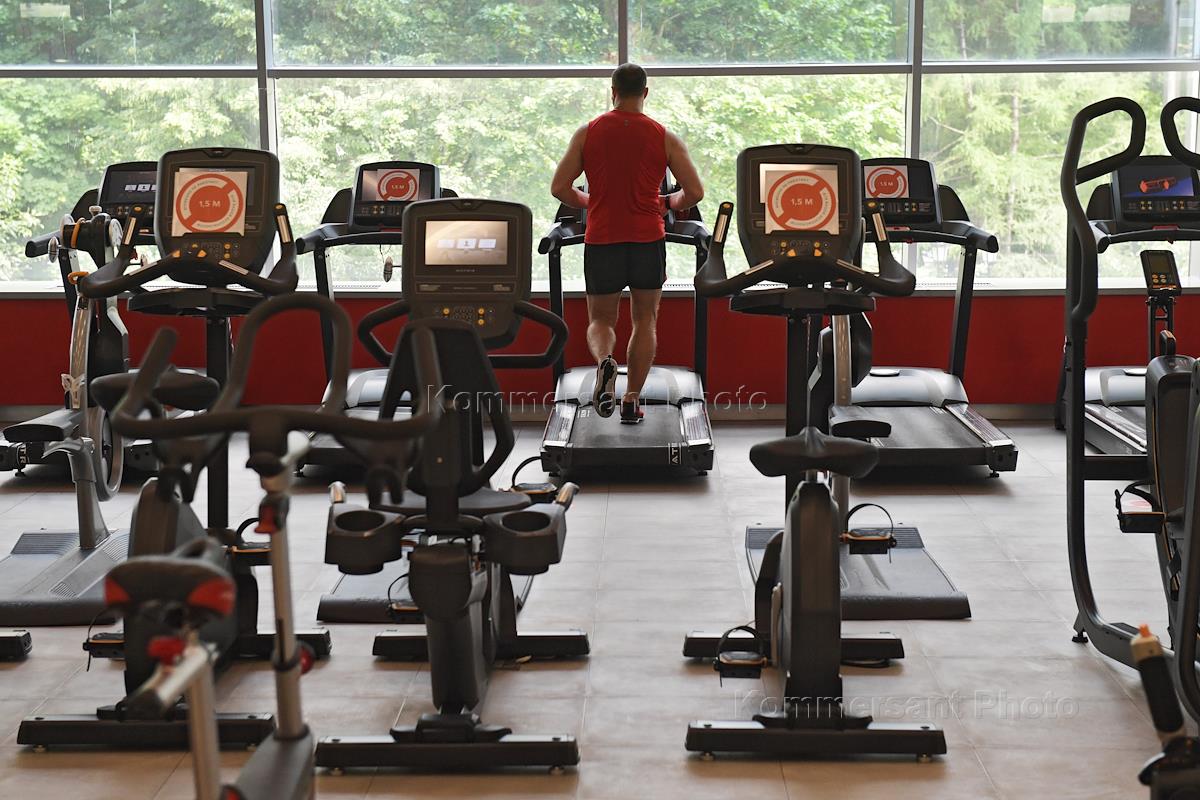 Работа фитнес-клуба WorldClass на Ленинском проспекте в торгово-развлекательном центре (ТРЦ) "Рио". Члены клуба в тренажерном зале.