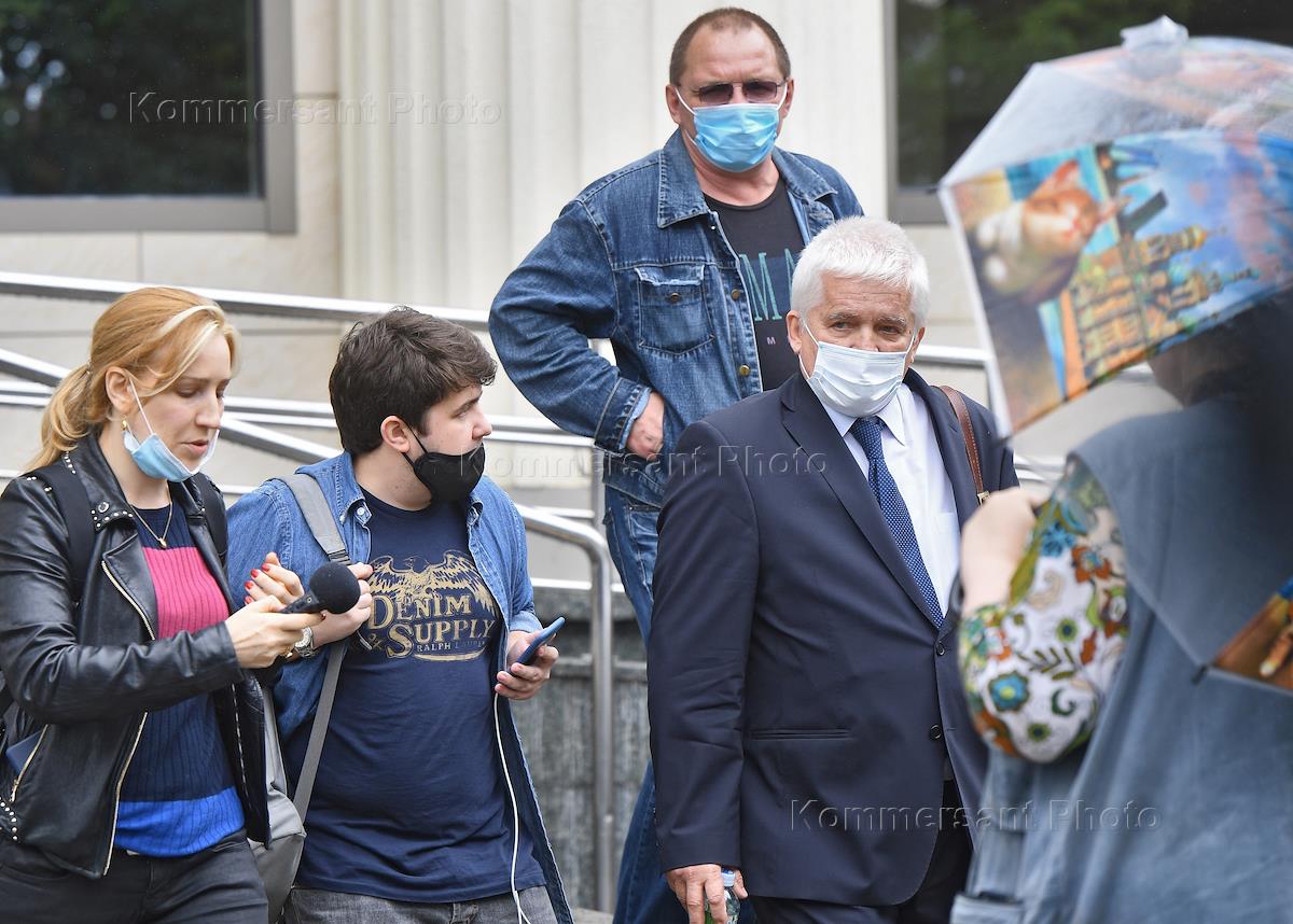Заседание по делу губернатора Хабаровского края Сергея Фургала, обвиняемого в организации покушений на убийство и убийствахв, в Мосгорсуде. Адвокат Борис Кожемякин (в центре) после заседания суда.