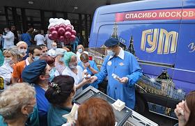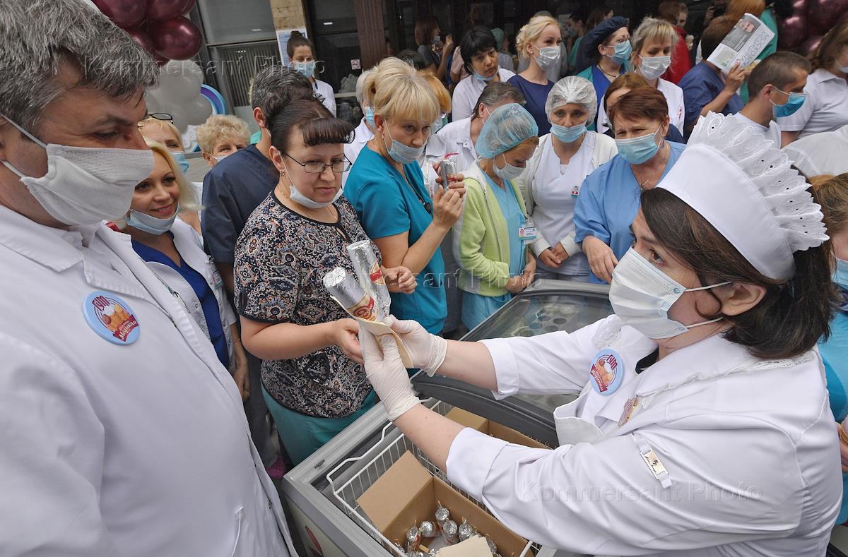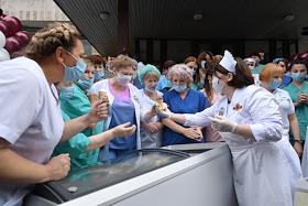 Благотворительное мероприятие "ГУМ-Мороженое медикам!". Мероприятие, посвященное медицинским работникам, которые боролись против пандемии коронавируса, провели в ГУМе и НИИ скорой помощи имени Н.В.Склифосовского.