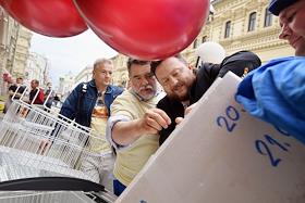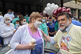Председатель наблюдательного совета компании Bosco di Ciliegi Михаил Куснирович (слева) и исполняющая обязанности главного врача Научно-исследовательского института скорой помощи им. Н. В. Склифосовского Наталия Дроздова (справа) во время благотворительного мероприятия "ГУМ-мороженое медикам!". Мероприятие, посвященное медицинским работникам, которые боролись против пандемии коронавируса, провели в ГУМе и НИИ скорой помощи имени Н.В.Склифосовского.