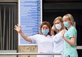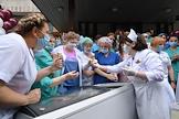 Исполняющая обязанности главного врача Научно-исследовательского института скорой помощи им. Н. В. Склифосовского Наталия Дроздова (третья слева) во время благотворительного мероприятия "ГУМ-мороженое медикам!". Мероприятие, посвященное медицинским работникам, которые боролись против пандемии коронавируса, провели в ГУМе и НИИ скорой помощи имени Н.В.Склифосовского.