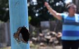 Военные действия на границе Азербайджана и Армении. Женщина демонстрирует последствия обстрела ворот.