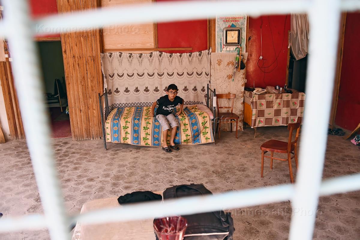 Военные действия на границе Азербайджана и Армении. Жанровая фотография. Мальчик сидит на кровати в доме.