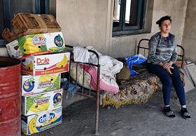 Военные действия на границе Азербайджана и Армении. Последствия обстрела жилого дома. Женщина сидит на кровати на улице.