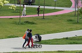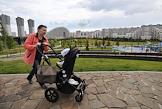 Парк "Ходынское поле". Жанровая фотография. Женщина гуляет с ребенком в коляске по парку.