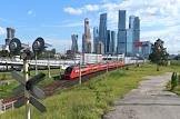 Жанровая фотография. Московские центральные диаметры (МЦД). Поезд во время движения. Московский международный деловой центр "Москва Сити".