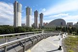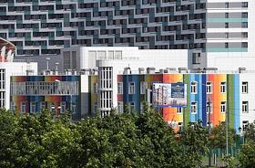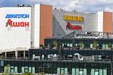 Парк "Ходынское поле". Жанровая фотография. Здания торгового центра "Авиапарк". Вывески магазинов "Ашан", "Декатлон" и ИКЕА на здании.