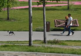 Парк "Ходынское поле". Жанровая фотография. Люди гуляют с собакой по парку. Закрытые ограничительной лентой скамейки парка.