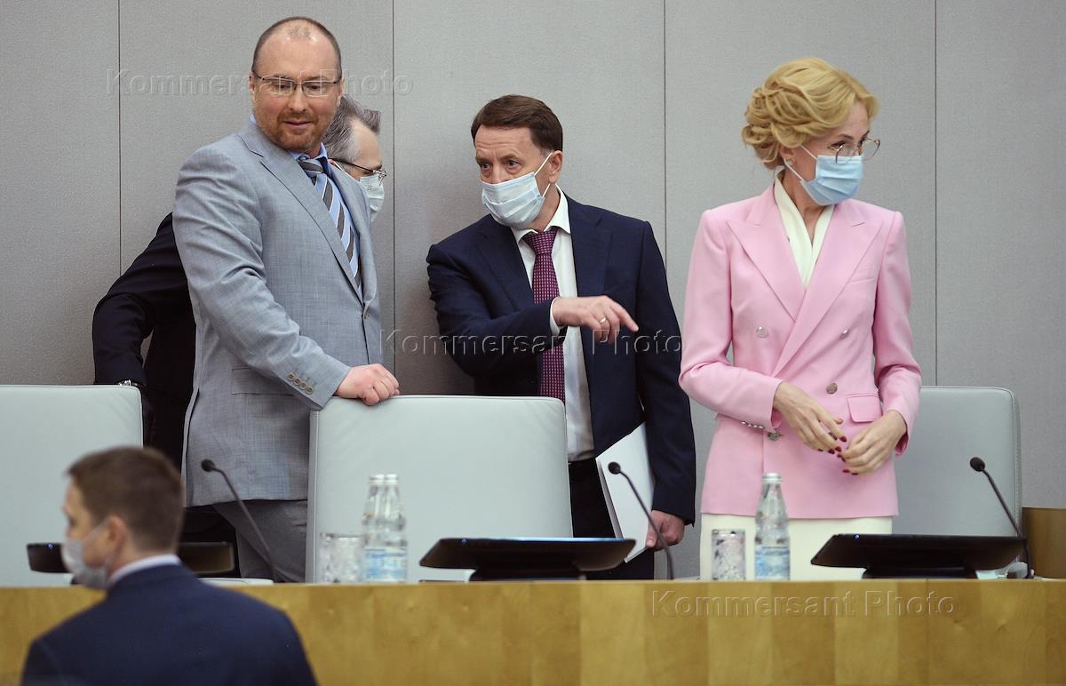 Пленарное заседание Государственной думы (ГД) России. Отчет о деятельности Правительства России за 2019 год. Справа налево: председатель Правительства России Михаил Мишустин, первый заместитель председателя ГД России Александр Жуков и заместитель председателя ГД России Ольга Епифанова во время заседания.