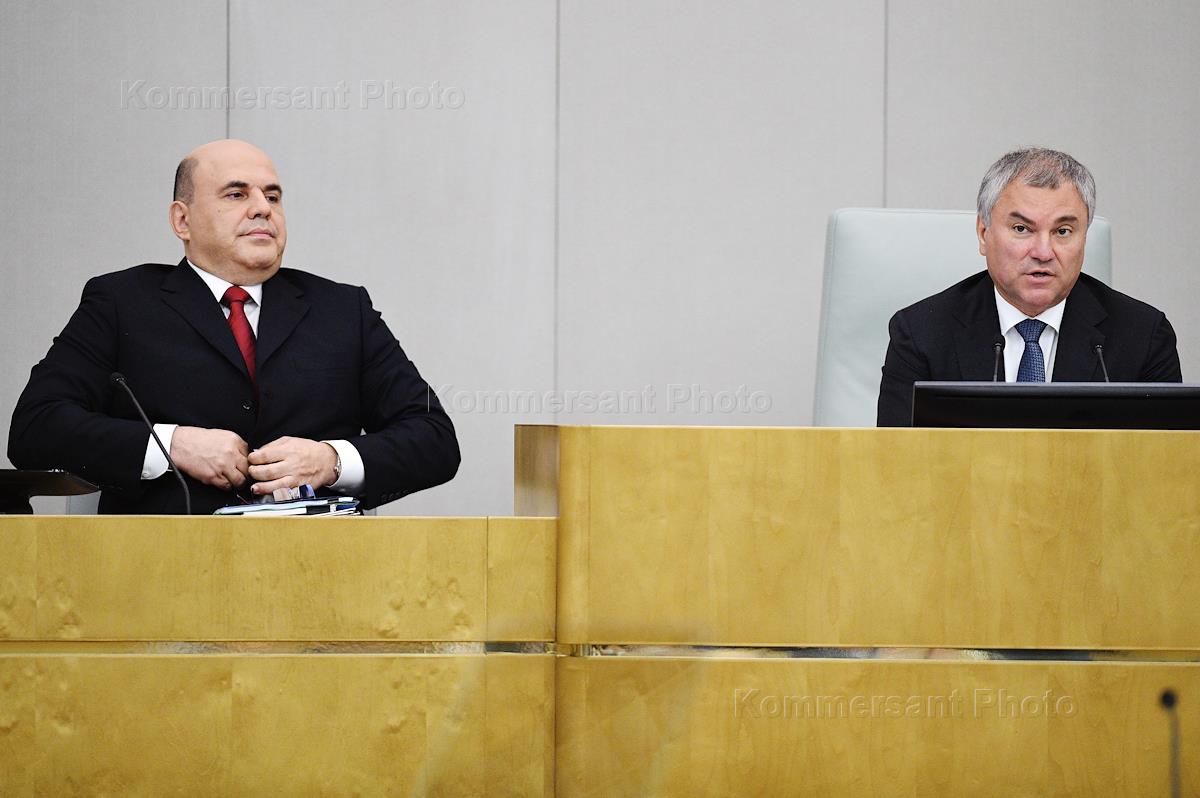 Пленарное заседание Государственной думы (ГД) России. Отчет о деятельности Правительства России за 2019 год. Председатель ГД России Вячеслав Володин (справа) и председатель Правительства России Михаил Мишустин (слева) во время заседания.