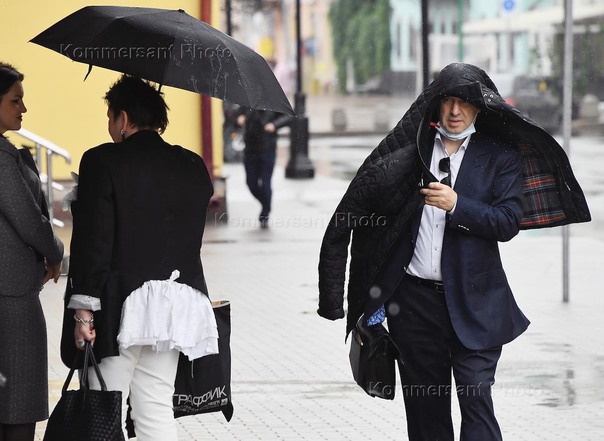 Работа отделения АО "Райффайзен Банк" (Raiffeisen Bank). Жанровая фотография. Мужчина в костюме накрыл голову плащом от дождя.