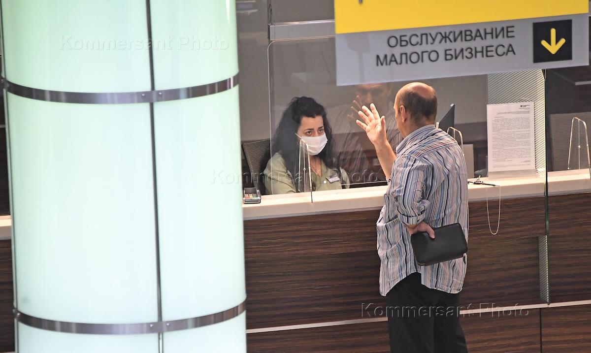 Работа отделения АО "Райффайзен Банк" (Raiffeisen Bank) на улице Смоленская-Сенная, дом 28. Жанровая фотография. Сотрудница банка в защитной маске во время обслуживания клиента. Указатель "Обслуживание малого бизнеса".