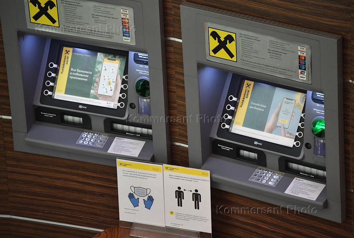 Work of Raiffeisen Bank branch on 28 Smolenskaya-Sennaya street. Bank employees. Genre photo. Bank client wearing gloves holds with ruble bills near an ATM.