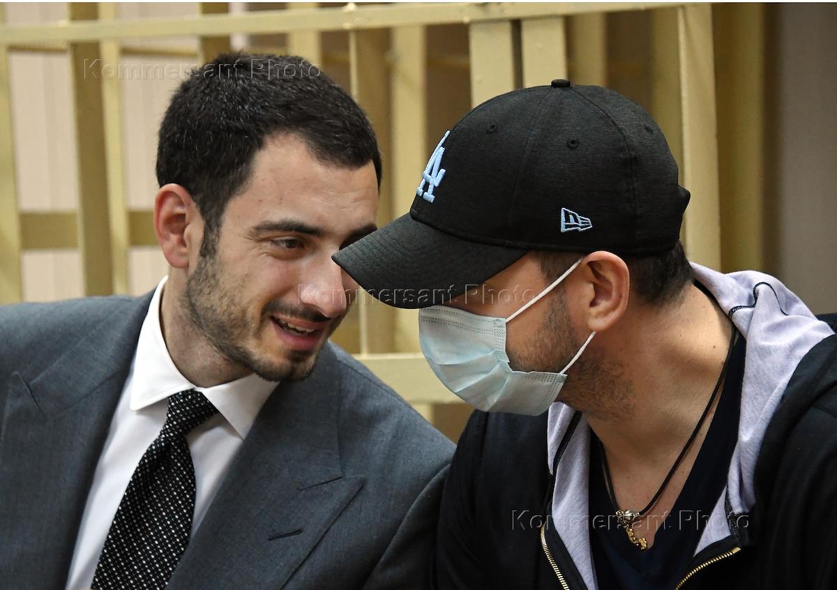 Former assistant to the head of Rosselkhoznadzor Dmitry Natarov (left), accused of committing indecent acts of a sexual nature against a minor and receiving a bribe, after a meeting of the Presnensky District Court.
