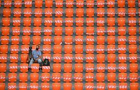Кубок России по футболу "Олимп". Финал. Матч между командами "Химки" (Московская область) - "Зенит" (Санкт-Петербург) на стадионе "Екатеринбург Арена". Фотограф на пустой трибуне во время матча.