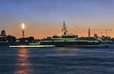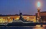 Празднование Дня Военно-Морского Флота (ВМФ). Военный корабль в световой иллюминации в акватории реки Невы.
