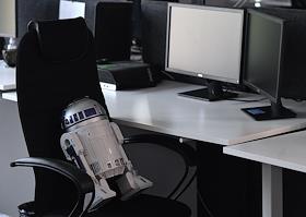 Офис компании "Новые облачные технологии". Жанровая фотография. Игрушка робот на стуле сотрудника.