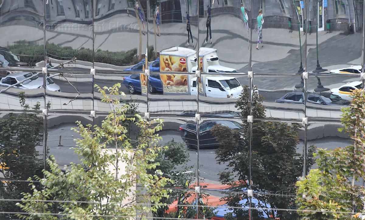Жанровая фотография. Отражение движущихся автомобилей в зеркальном фасаде здания.