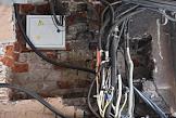 Жанровая фотография. Рабочие на автовышке во время осмотра балкона, требующего ремонта.