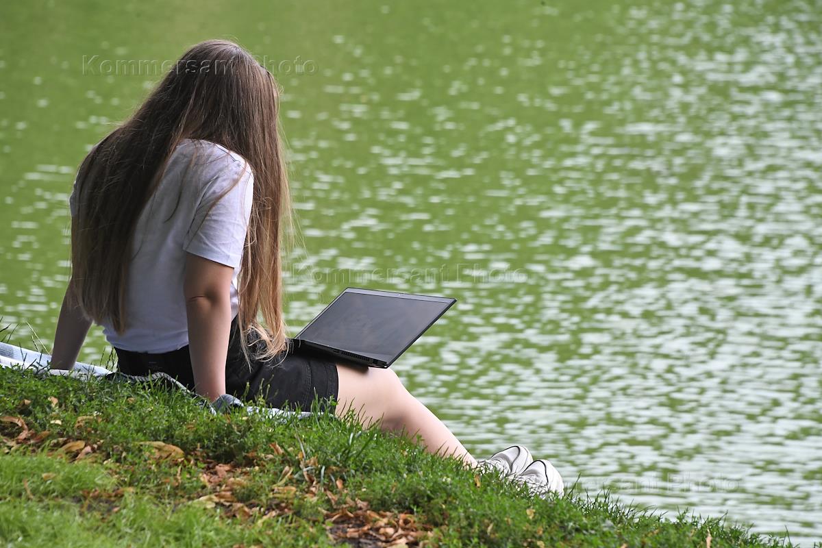 Жанровая фотография. Девушка с ноутбуком на коленях на берегу водоема.