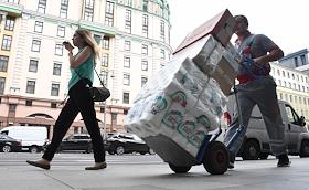 Жанровая фотография. Грузчик везет упаковки товара на тележке.