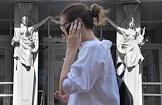 Жанровая фотография. Женщина с мобильным телефоном между скульптурами в стиле модерн.