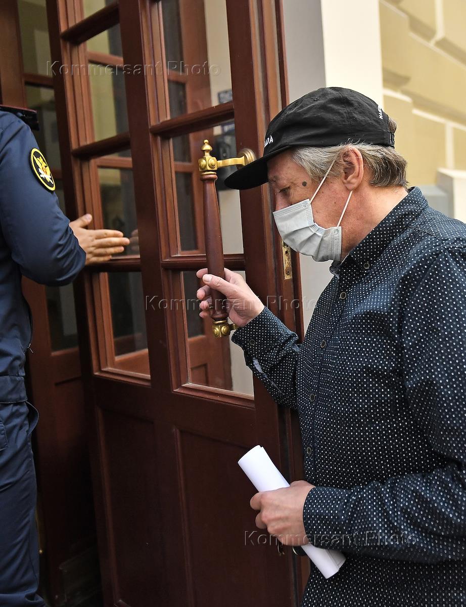 Актер Михаил Ефремов у своего дома на улице Плотников переулок перед заседанием Пресненского районного суда. 8 июня 2020 года Михаил Ефремов, находившийся за рулем автомобиля Jeep Grand Cherokee, выехал на полосу встречного движения и столкнулся с фургоном. Водитель автомобиля Сергей Захаров, в который въехал джип Ефремова, погиб.
