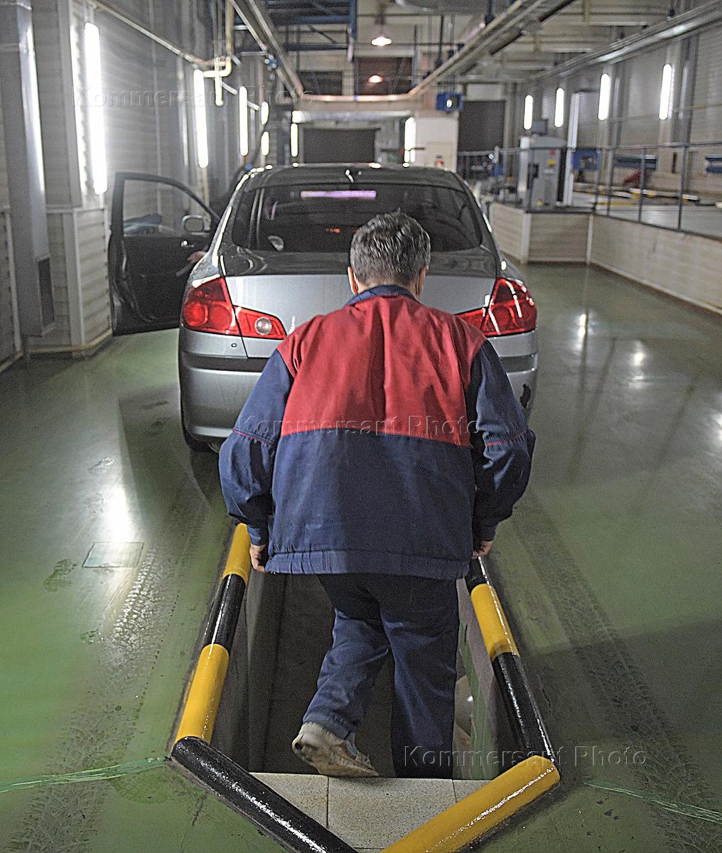 Работа пункта технического осмотра автомобилей. Проверка шасси автомобиля на стенде.