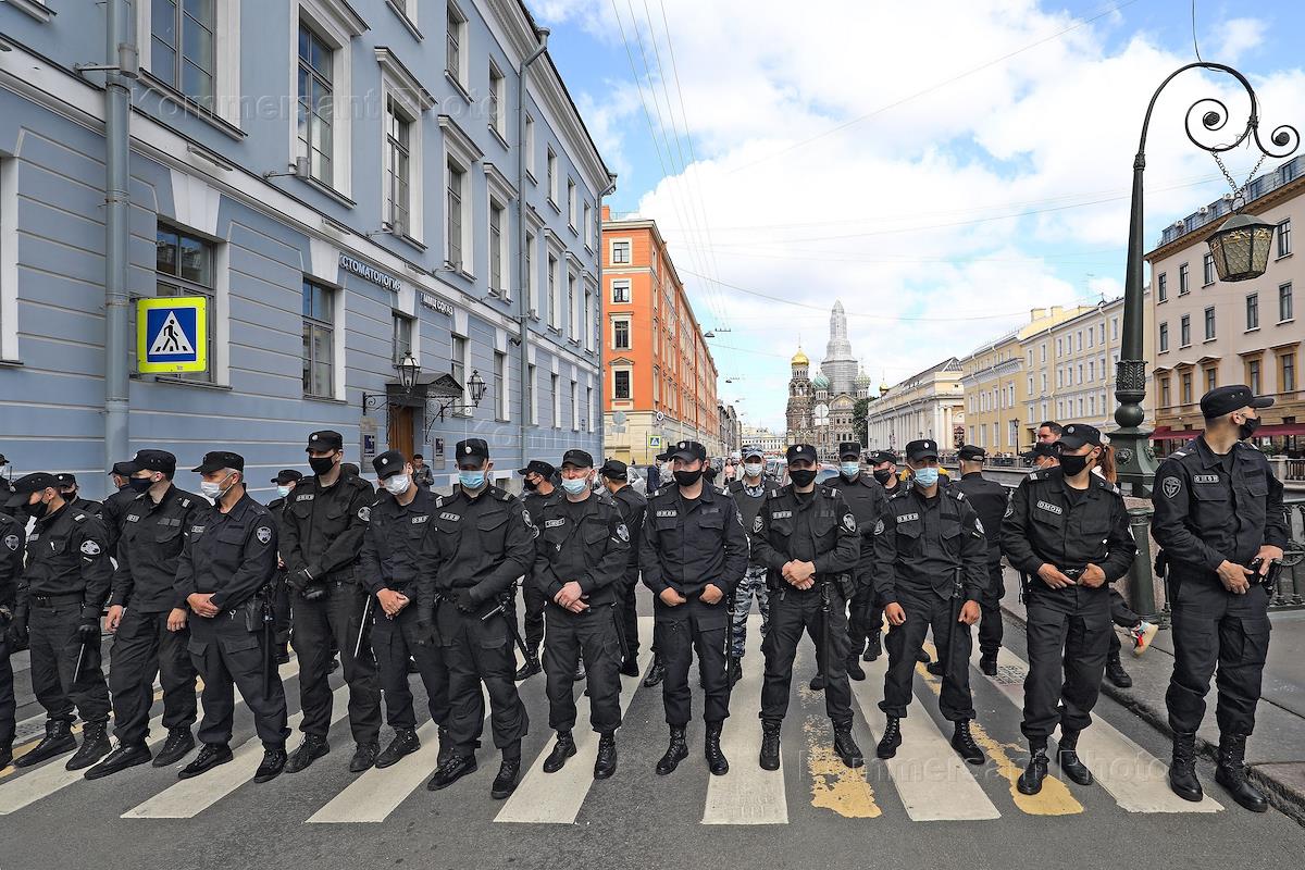 Акция солидарности с протестующими в Хабаровске. Участники акции и сотрудники полиции на Невском проспекте.