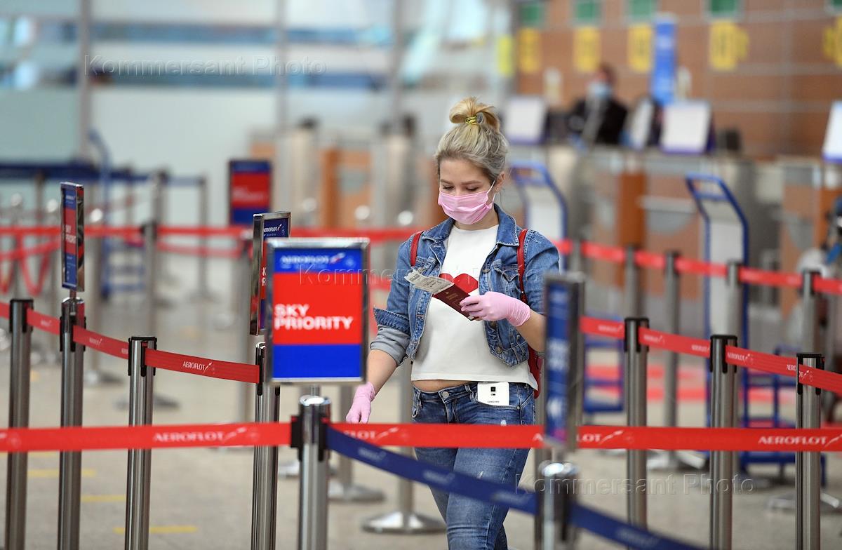 Международный аэропорт Шереметьево имени А.С.Пушкина. Жанровая фотография. Пассажиры в медицинских масках в здании аэропорта.
