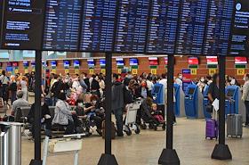 Международный аэропорт Шереметьево имени А.С.Пушкина. Жанровая фотография. Пассажиры возле табло вылетов в здании аэропорта.