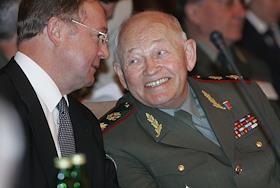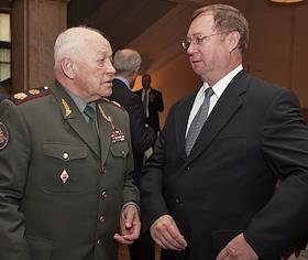 Бывший министр обороны России, маршал Игорь Сергеев (слева) и председатель Счетной палаты России Сергей Степашин (справа) во время заседания "Круглого стола" на тему: "Использование потенциала военачальников в борьбе с современными вызовами и угрозами". "Круглый стол" прошел на базе Объединенного штаба Организации договора о коллективной безопасности (ОДКБ).