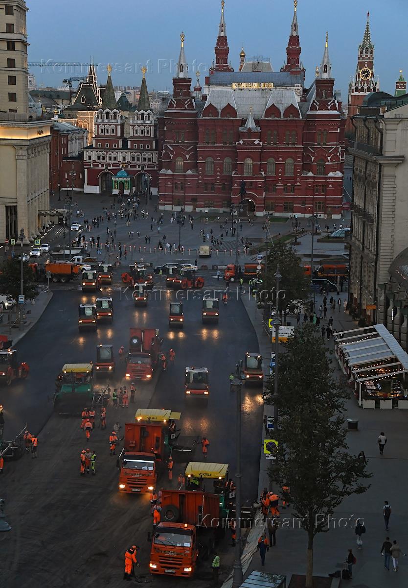 Виды Москвы. Ремонтные работы по замене асфальтового покрытия проезжей части на Тверской улице.