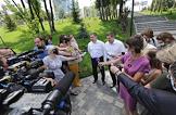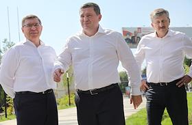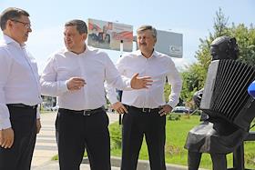 Рабочая поездка министра строительства и жилищно-коммунального хозяйства России Владимира Якушева в Волгоград. Министр строительства и жилищно-коммунального хозяйства России Владимир Якушев (слева) и губернатор Волгоградской области Андрей Бочаров (в центре) во время посещения сквера имени Александры Пахмутовой.