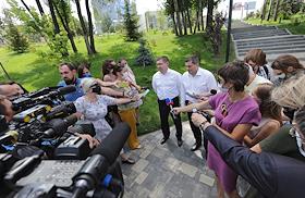 Рабочая поездка министра строительства и жилищно-коммунального хозяйства России Владимира Якушева в Волгоград. Министр строительства и жилищно-коммунального хозяйства России Владимир Якушев (в центре слева) и губернатор Волгоградской области Андрей Бочаров (в центре справа) во время встречи с журналистами.