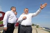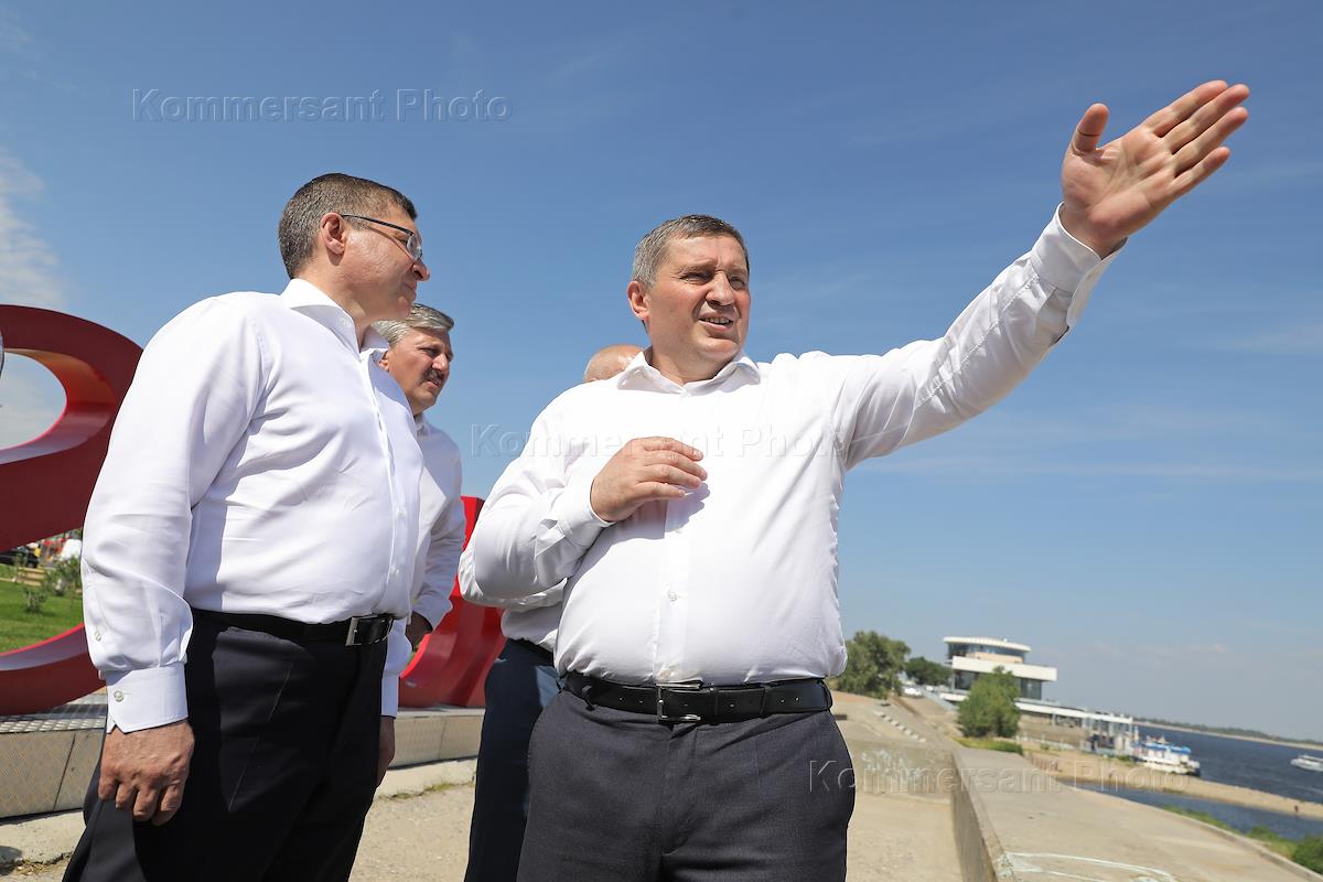Рабочая поездка министра строительства и жилищно-коммунального хозяйства России Владимира Якушева в Волгоград. Министр строительства и жилищно-коммунального хозяйства России Владимир Якушев (слева) и губернатор Волгоградской области Андрей Бочаров (справа) во время проверки хода реконструкции набережной реки Царица.