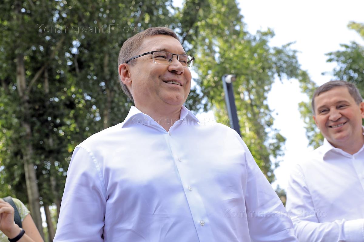 Рабочая поездка министра строительства и жилищно-коммунального хозяйства России Владимира Якушева в Волгоград. Министр строительства и жилищно-коммунального хозяйства России Владимир Якушев (слева) и губернатор Волгоградской области Андрей Бочаров (в центре) во время посещения сквера имени Александры Пахмутовой.
