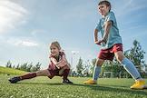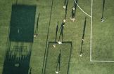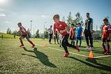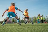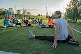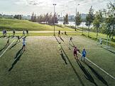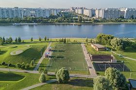 Спортивные тренировки на футбольном поле в Братеевском каскадном парке, на берегу Москва-реки.