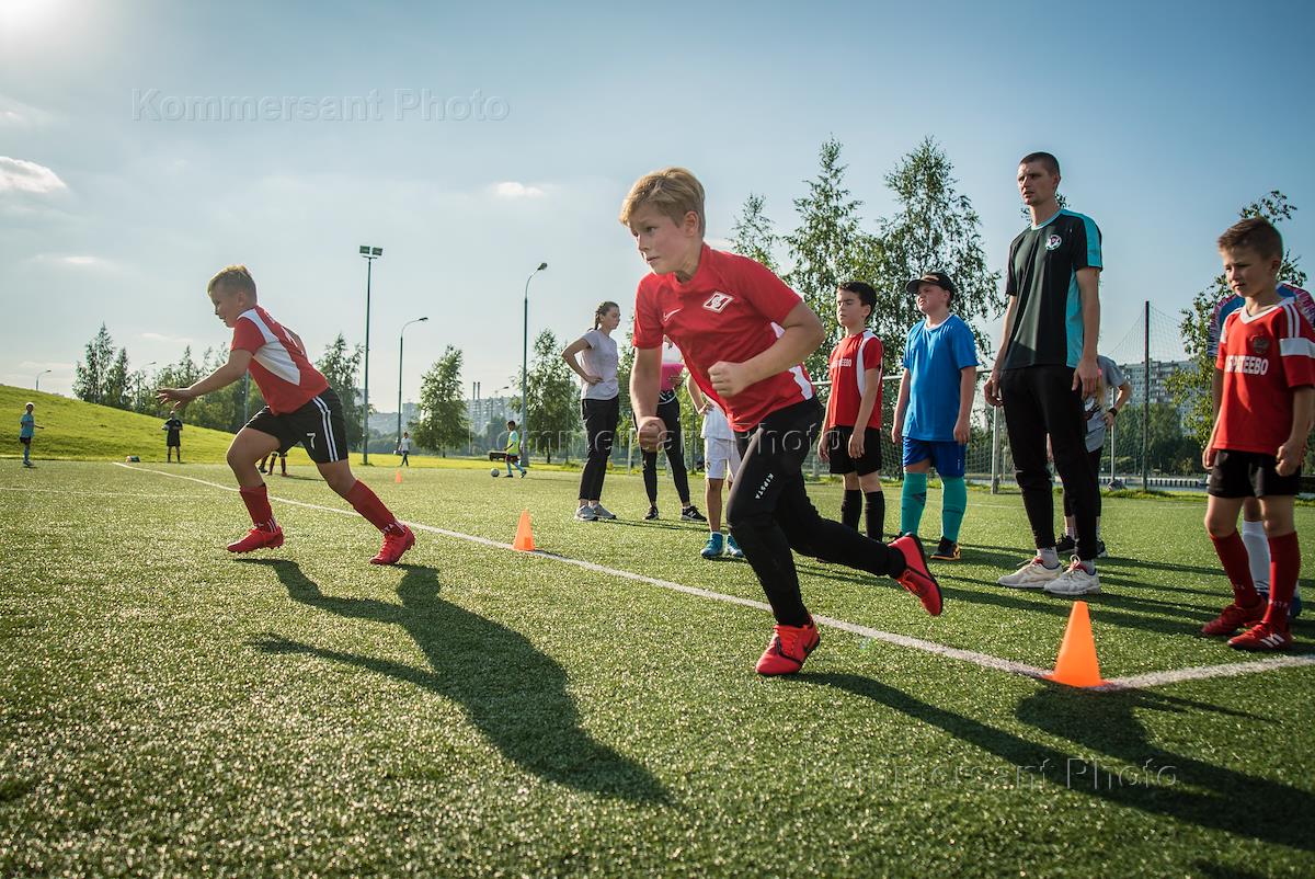 Спортивные тренировки на футбольном поле в Братеевском каскадном парке, на берегу Москва-реки.