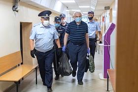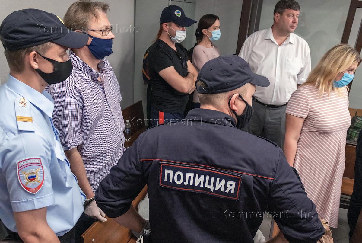 Вынесение приговора по делу о хищении миллионов рублей в Казанском национальном исследовательском технологическом университете (КНИТУ-КХТИ) состоялось в Вахитовском районном суде Казани. Бывший ректор КНИТУ-КХТИ Герман Дьяконов (второй слева), обвиняемый по делу, во время ареста в зале суда.