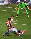 Russian Premier League (RPL). Russian Football Championship 2020/2021. Matchday 1. Match between Spartak (Moscow) and Sochi (Sochi) at the Otkrytie Arena stadium. Sochi's Nikita Burmistrov (left) and Spartak player Alex Kral (right) in action during the match.