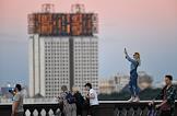 Виды Москвы. Жанровая фотография. Отдыхающие на смотровой площадке на Воробьевых горах. Здание Президиума Российской академии наук (РАН).