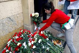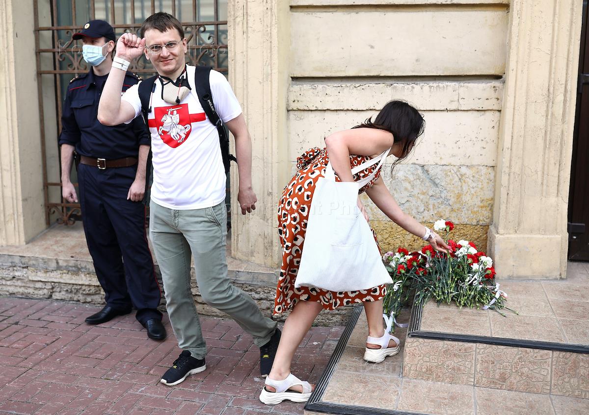 Акция в поддержку жителей Белоруссии после проведения президентских выборов возле входа в отделение посольства Белоруссии в Санкт-Петербурге.