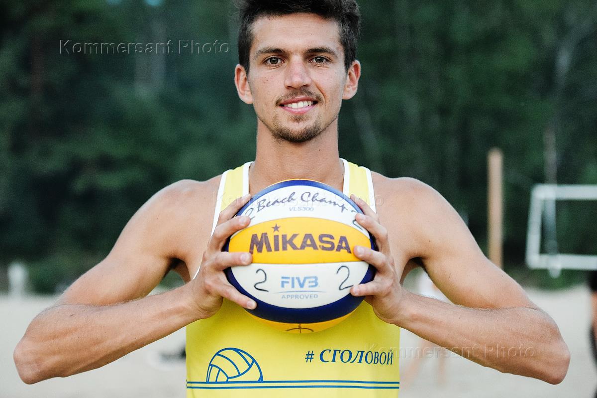 Жанровая фотография. Тренировка по пляжному волейболу. Игрок держит волейбольный мяч в руках.