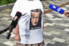 Рассмотрение по существу уголовного дела в отношении актера Михаила Ефремова о ДТП со смертельным исходом с участием актера в Пресненском районном суде. Вечером 8 июня на Садовом кольце Ефремов за рулем Jeep Grand Cherokee выехал на встречную полосу и столкнулся с автомобилем Lada, водитель которого впоследствии умер в больнице. Общественный активист в футболке с принтованным портретом Михаила Ефремова (справа) перед зданием суда.