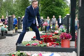Церемония памяти по погибшим двадцать лет назад морякам атомной подводной лодки "Курск" на Серафимовском кладбище. Губернатор Санкт-Петербурга Александр Беглов во время церемонии.