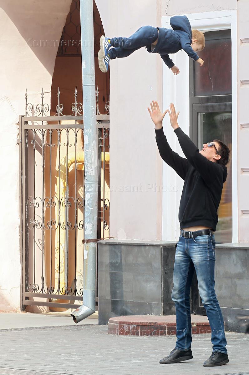 Виды Нижнего Новгорода. Жанровая фотография. Мужчина играет с ребенком на улице, подбрасывая его в воздух.