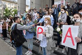 Ситуация в Минске. День четвертый. Участники хора Белорусской государственной филармонии у входа в Концертный зал во время забастовки в знак протеста против насилия и фальсификаций на выборах президента Белоруссии.