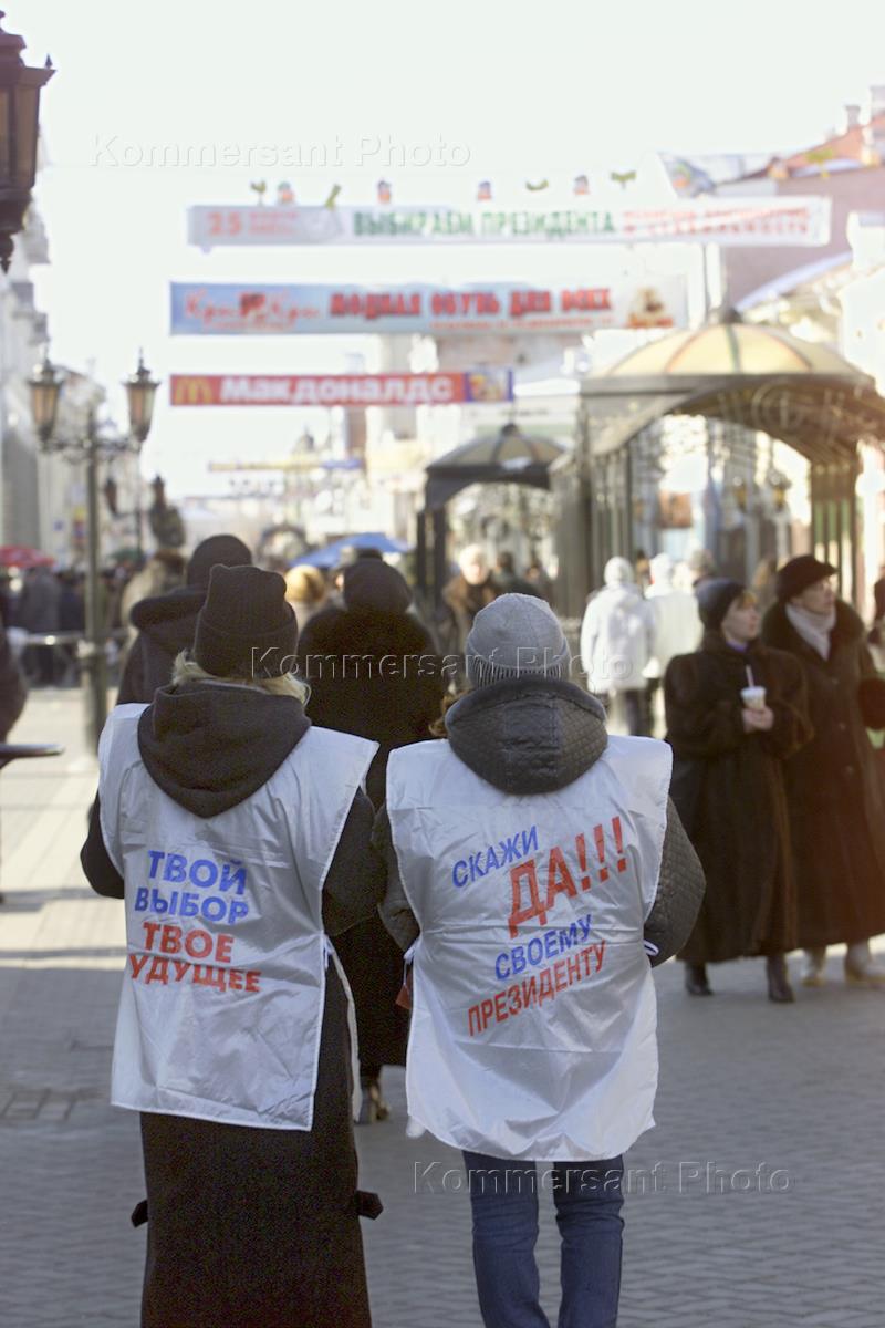 People wearing jackets with advertising before the elections of a Tatarstan Republic President at Kazan.